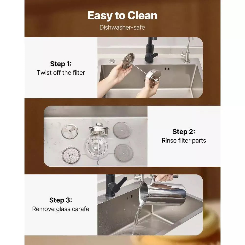 Double-Wall Insulated Stainless Steel: The French press coffee maker is crafted from food-grade 304 stainless steel—corrosion-resistant, rustproof, and durable. Its double-wall vacuum insulation keeps coffee hot and the exterior cool to the touch Precision Filtration System: Our coffee press features a fine filtration system with a 304 stainless steel spiral plate, mesh filter, and cross plate. It effectively removes coffee grounds for a smooth taste Easy Brewing Experience: This stainless steel French press features a simple press-down design that lets you brew rich coffee in just minutes. The ergonomic, non-slip handle provides effortless and stable pouring Easy to Clean: This French coffee press features a smooth stainless steel surface, removable filter and plunger for effortless cleaning. All parts disassemble easily for deep cleaning and are fully dishwasher-safe Versatile for Multiple Uses: The silver stainless steel coffee press brews more than just coffee—use it for tea, cold brew, or frothed milk. Its 51 oz / 1.5L capacity suits home or office use, with a classic polished look that fits any décor