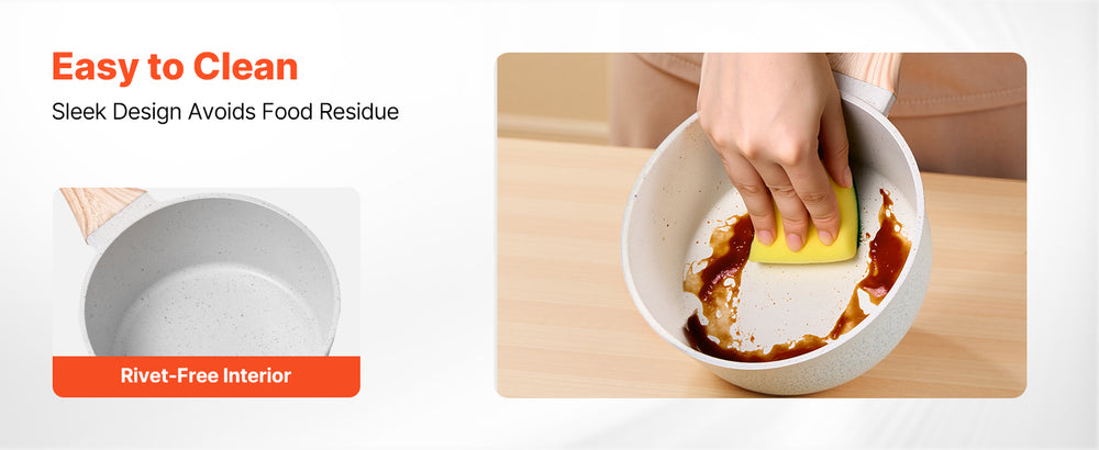 The nonstick marble coating is excellent stain-resistant — just a simple wipe and it’s clean. The seamless one-piece die-cast design with no interior rivets helps avoid food buildup, making cleanup even easier.