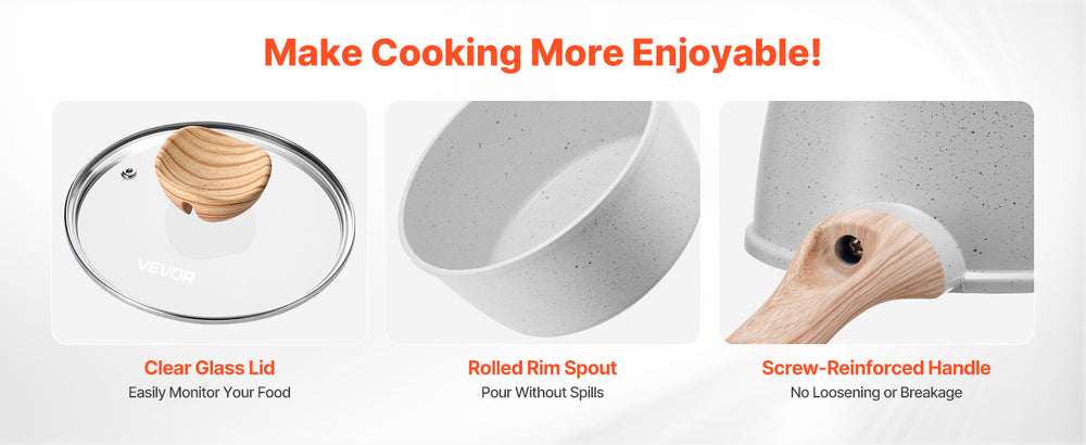 The nonstick pot comes with a thickened transparent glass lid for easy monitoring, a flared rim for drip-free pouring of soup or milk, and a screw-secured reinforced handle for enhanced stability. The handle is easy to install and built to last.