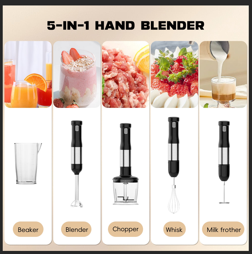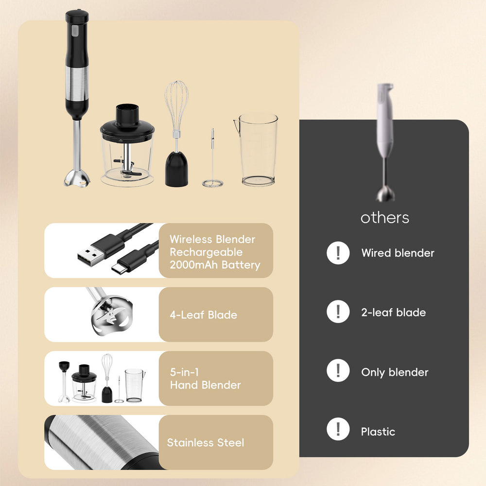 WhallPro® Cordless Immersion Hand Blender, 5-in-1 Cordless Hand Blender Set – Rechargeable, One-Touch Control and Stainless Steel Blades for Smoothies, Shakes or Soups, Black