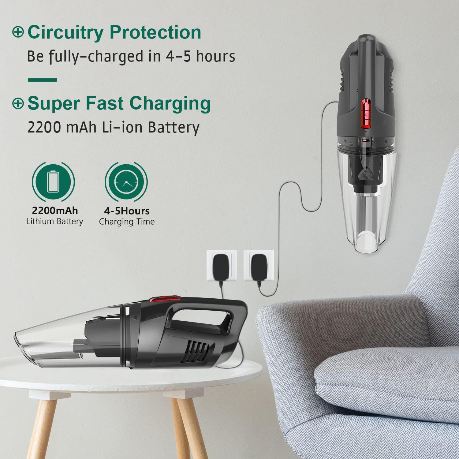 - 💝【Quick Charge & Battery】Hand held vacuuming cordless with battery and quick charge tech and outstanding performance. Handheld vacuums have temperature protection, input voltage input current protection,and short circuit protection,ensure equipment safety throughout the charging process. Car vacuum cleaner could work constantly for 20-30 minutes after fully charged for 4-5 hours. The handheld vacuum with wall mount. This handheld vacuum cordless voltage of the charger is 14.8V, it be used with 110v - 220v sockets.