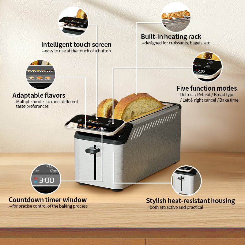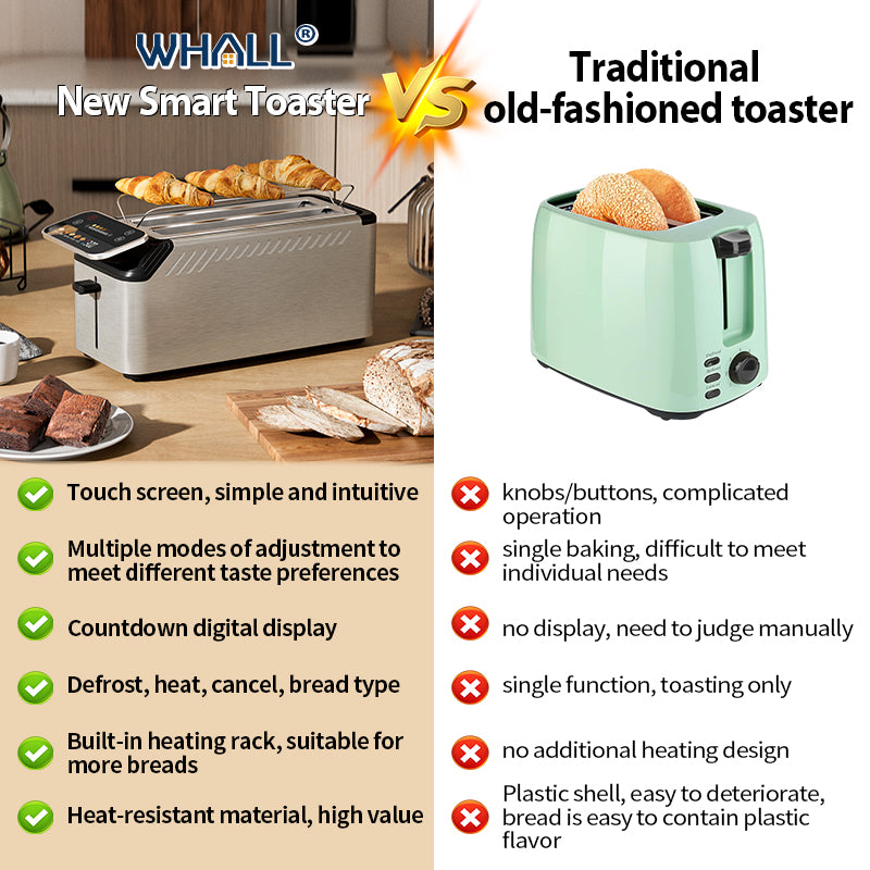 WhallPro® Stainless Steel Smart Toaster, 2 Slice | Projection Touchscreen, 1.5" Extra-Wide Slots, Digital Timer, Reheat & Defrost, Warming Rack, Removable Crumb Tray